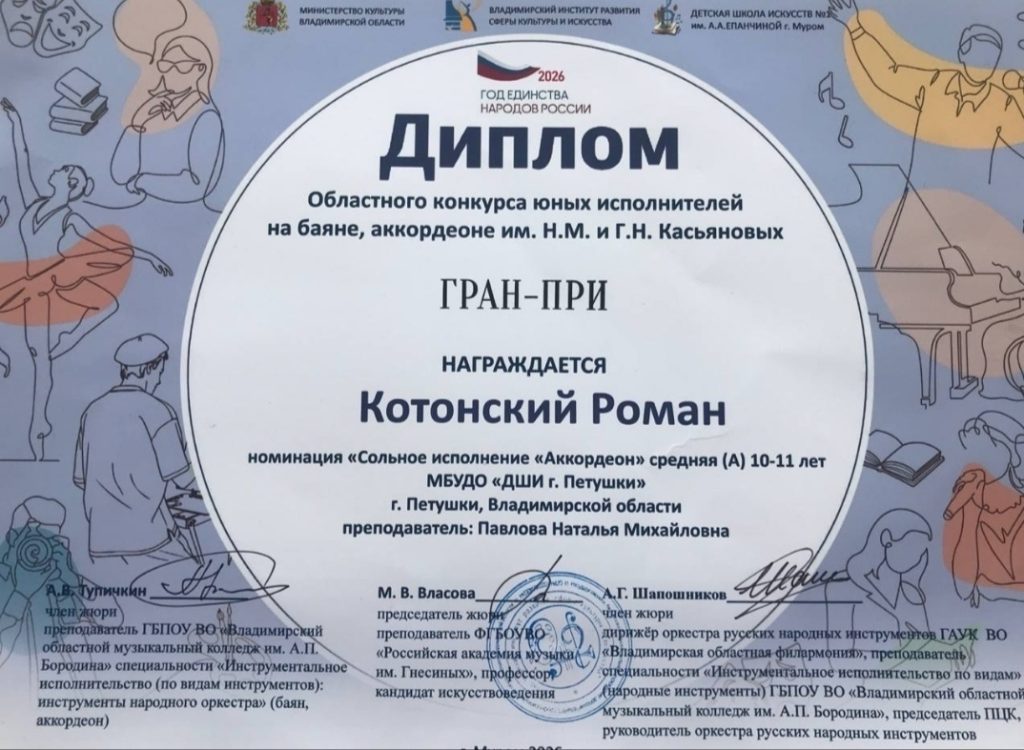 26 Фев Новости Роман Котонский стал обладателем ГРАН-ПРИ областного конкурса юных исполнителей на баяне, аккордеоне им. Касьяновых! 26.02.2026 By Admin Посмотреть